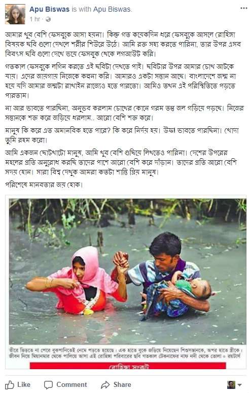 সারা বিশ্বের মানবিক মানুষকে নাড়িয়ে দিচ্ছে মায়ানমারের চলমান রোহিঙ্গা সংকট। অসহায় মানুষগুলোর ওপর দেশটির সরকারের অমানবিক আচরণ দেখে চোখের জল ধরে রাখতে পারেননি ঢাকাই চলচ্চিত্রের তুমুল জনপ্রিয় নায়িকা অপু বিশ্বাস। এক ফেসবুক স্ট্যাটাসের মাধ্যমে তিনি প্রকাশ করেছেন নিজের অনুভূতি। দেশের সরকারসহ সবাইকে আহ্বান জানিয়েছেন রোহিঙ্গা শরণার্থীদের প্রতি সহযোগিতার হাত বাড়িয়ে দিতে।