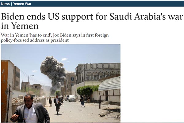 এর আগে বৃহস্পতিবার( ৪ ফেরবুয়ারি) মার্কিন প্রেসিডেন্ট জো বাইডেন প্রথম পররাষ্ট্র নীতি বিষয়ক ভাষণে ইয়েমেনে সৌদি আরবের অভিযানে সহযোগিতা বন্ধের ঘোষণা দেন। তিনি বলেন, ইয়েমেনে চলমান যুদ্ধের অবসান ঘটাতেই হবে। প্রতিশ্রুতি রক্ষার অংশ হিসেবে অস্ত্র বিক্রিসহ ইয়েমেন যুদ্ধে আক্রমণাত্মক অভিযানের জন্য যুক্তরাষ্ট্রের সব সমর্থন বন্ধ ঘোষণা করছি। এ সময় ইয়েমেনে নতুন মার্কিন রাষ্ট্রদূত হিসেবে সিনিয়র কূটনীতিক টিমোথি লেন্ডারিংয়ের নামও ঘোষণা করেন তিনি।
