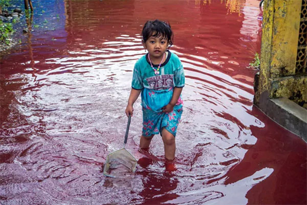 অদ্ভুত দৃশ্য ইন্দোনেশিয়ায়। রাস্তা ভর্তি লাল রঙের পানি থইথই করছে। দেশের জেনগোট এলাকায় সম্প্রতি এমনই দৃশ্য চোখে পড়েছে। কিছুদিন আগে ইন্দোনেশিয়া বন্যা পরিস্থিতির সৃষ্টি হয়েছিল। তখন একটি বাটিক ফ্যাক্টরিতে ঢুকে পড়ে পানি। তারপরই পানির রং হয়ে যায় লাল। এখন এলাকার রাস্তায় রাস্তায় এই লাল পানি চোখে পড়ছে।