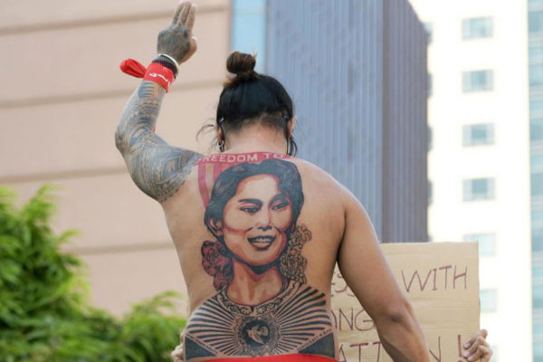 লাল রঙের পোশাকে মাথায় লাল ফিতা বেঁধে বিক্ষোভকারীরা জোরালো প্রতিবাদ করেন। লাল রং এনএলডির প্রতীক হিসেবে পরিচিত। স্লোগান দেওয়ার সময় বিক্ষোভকারীরা হাতের তিন আঙুল উঁচিয়ে ধরছিল। মিয়ানমারে এই তিন আঙুল কিংবা ‘থ্রি ফিঙ্গারস’ সামরিক সরকারবিরোধী প্রতীক হয়ে উঠেছে।